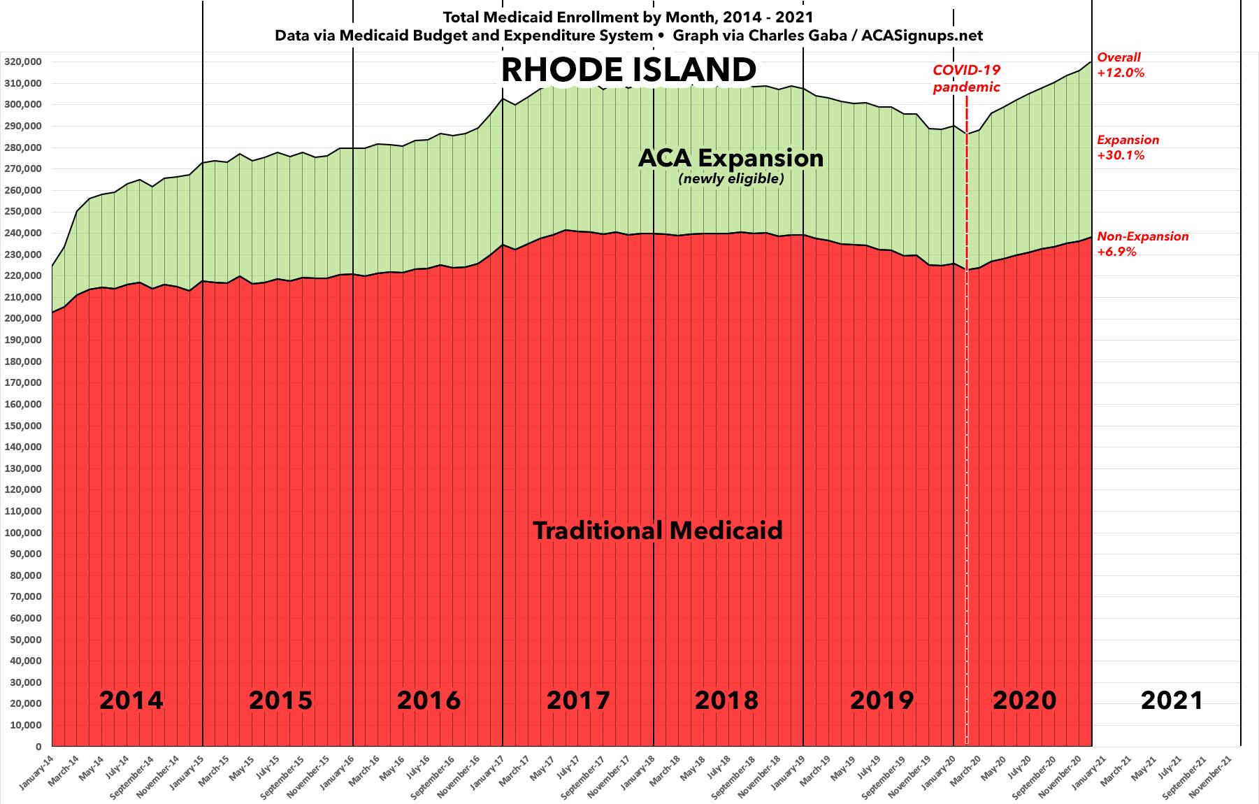 Rhode Island's total Medicaid enrollment (including ACA expansion) reached an all-time high of around 313,000 back in mid-2017. Since then it gradually dropped to around 290,000 just ahead of the COVID pandemic...but since then non-expansion enrollment has gone up by 7% and the ACA expansion population has risen by over 30%, meaning total enrollment is up 12% overall.