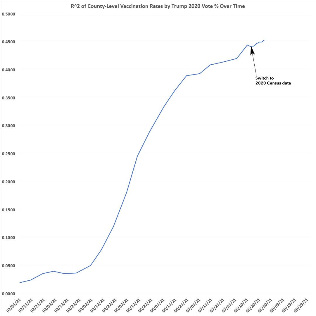 It's also important to note that while there was a very slight, one-time drop in both the R2 (correlation) and slope formulas a week or so ago when I switched from 2019 estimated population data to official 2020 U.S. Census data for every county, this drop has since reversed itself and continued its gradual climb higher on both the correlation and slope fronts: