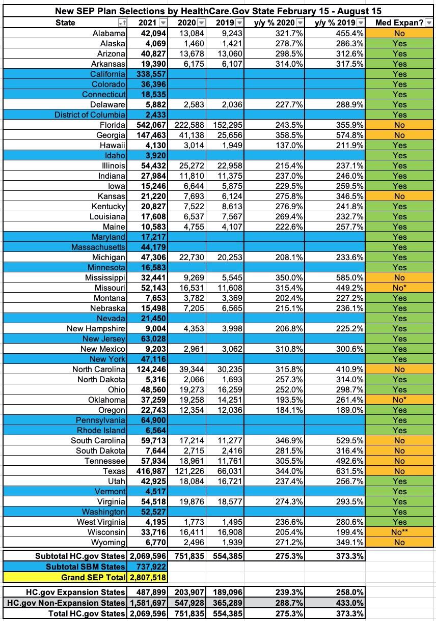 According to the official SEP report, the exact number of new enrollees nationally during the 2021 SEP from 2/15/21 - 8/15/21 was 2,807,518, so I was off by 52,482 enrollees. From the breakout below, it looks like HC.gov enrollments were about 20,000 higher than I expected, while SBE enrollments were around 70,000 lower. Ah, well.