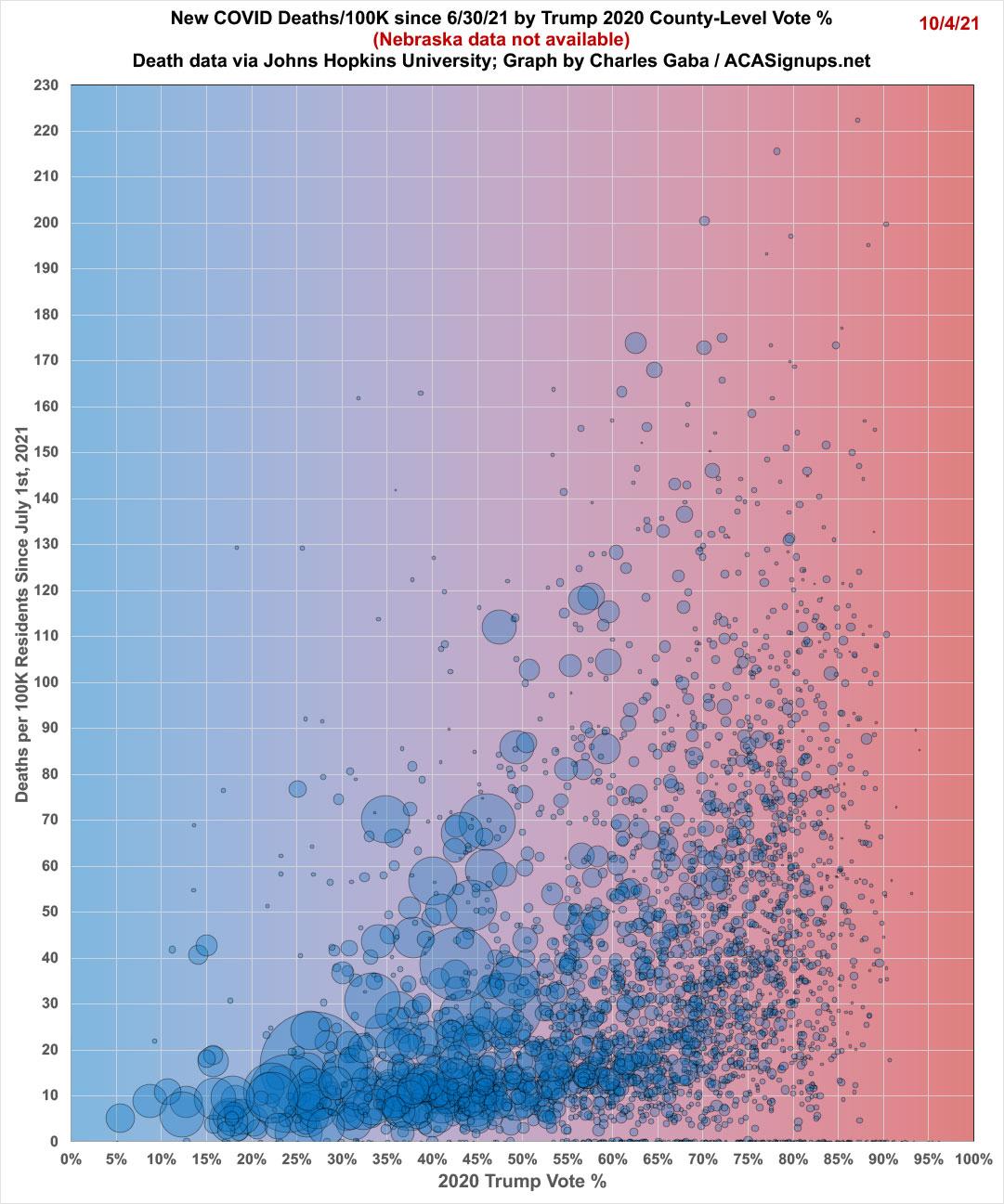 Since Delta began circulating widely in the U.S., Covid has exacted a horrific death toll on red America: In counties where Donald Trump received at least 70 percent of the vote, the virus has killed about 47 out of every 100,000 people since the end of June, according to Charles Gaba, a health care analyst. In counties where Trump won less than 32 percent of the vote, the number is about 10 out of 100,000.