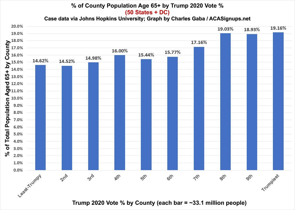 I decided to approach this issue in a slightly different way from either of them: I sorted out every county in the 50 U.S. states (+DC) by 2020 Trump vote based on what percent of their populations are 65 or older: