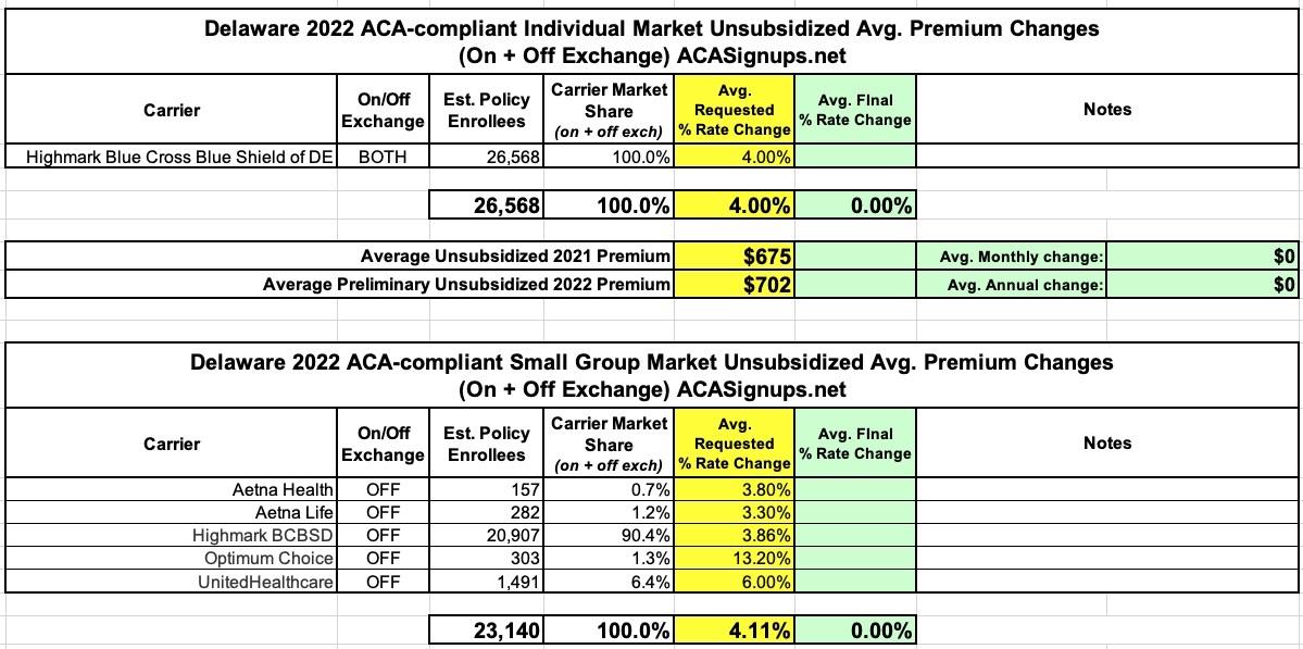 Delaware: Approved avg. 2022 #ACA rate change: +3.0% individual market; +4.1% sm. group market (preliminary) (updated)