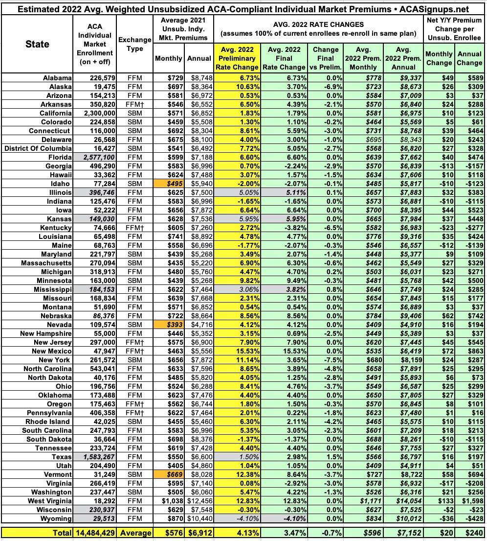 Keep in mind that all dollar amounts below assume UNSUBSIDIZED premiums. However, the vast majority of 2022 ACA exchange enrollees will be financially subsidized, bringing their net premiums down substantially; in fact, millions of them will pay no net premium at all, and none will have to pay any more than 8.5% of their household income for the benchmark Silver plan.
