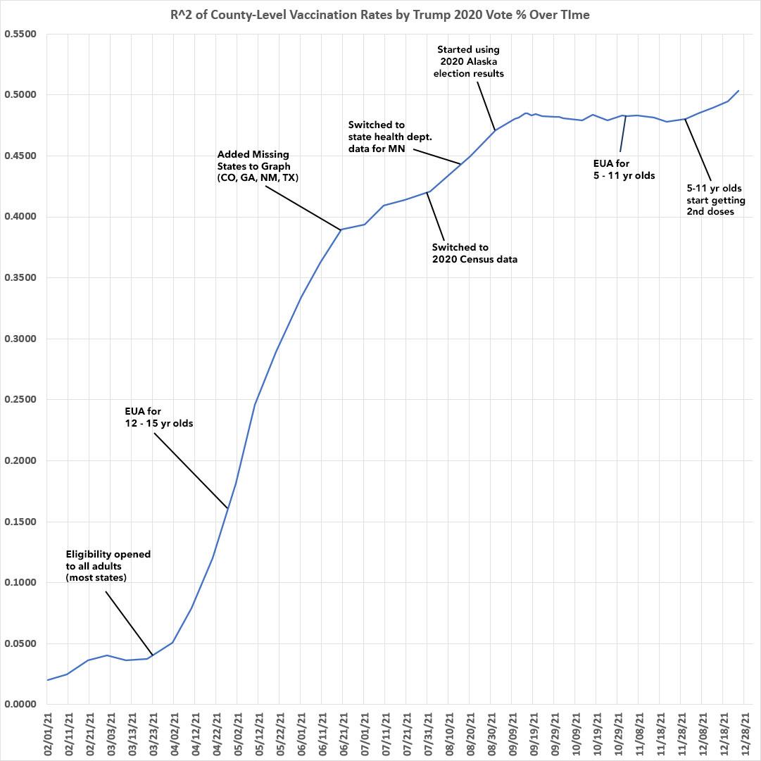 The most noteworthy thing this week is that the R-squared for this graph has moved over the 0.5 threshold for the first time since I started tracking the county-level vaccination data last spring. As I predicted back in mid-November, the most obvious reason for this is that 5 - 11 year-olds started receiving their 2nd Pfizer shot around Thanksgiving.