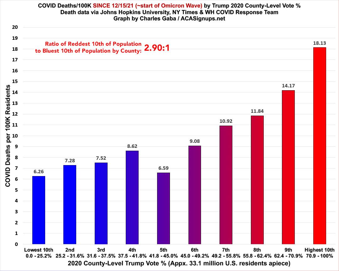 Here's the same data from a NONPARTISAN view: This is based purely on 2-dose vaccination rates (as of 12/15/21). Case rates in the least-vaccinated tenth of the U.S. ran 2.1x higher than in the most-vaccinated tenth, while death rates ran nearly 4.8x higher: