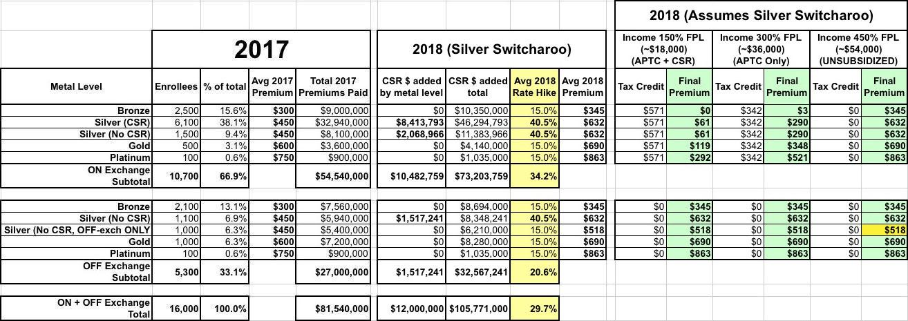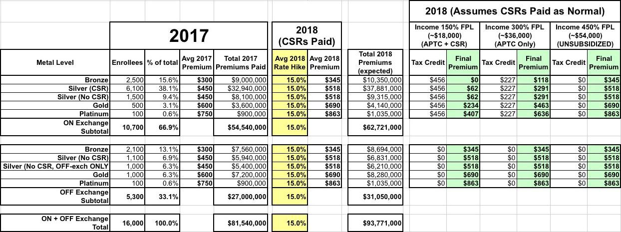 According to my data, on average nationally, unsubsidized 2018 individual market rates would have gone up around 15% assuming every carrier in every state assumed CSR payments would be made for 2018. That amounts to roughly $12.2 million in additional expenses total for all 16,000 enrollees as a whole (that is, around $93.8 million total in 2018 vs. $81.5 million in 2017).