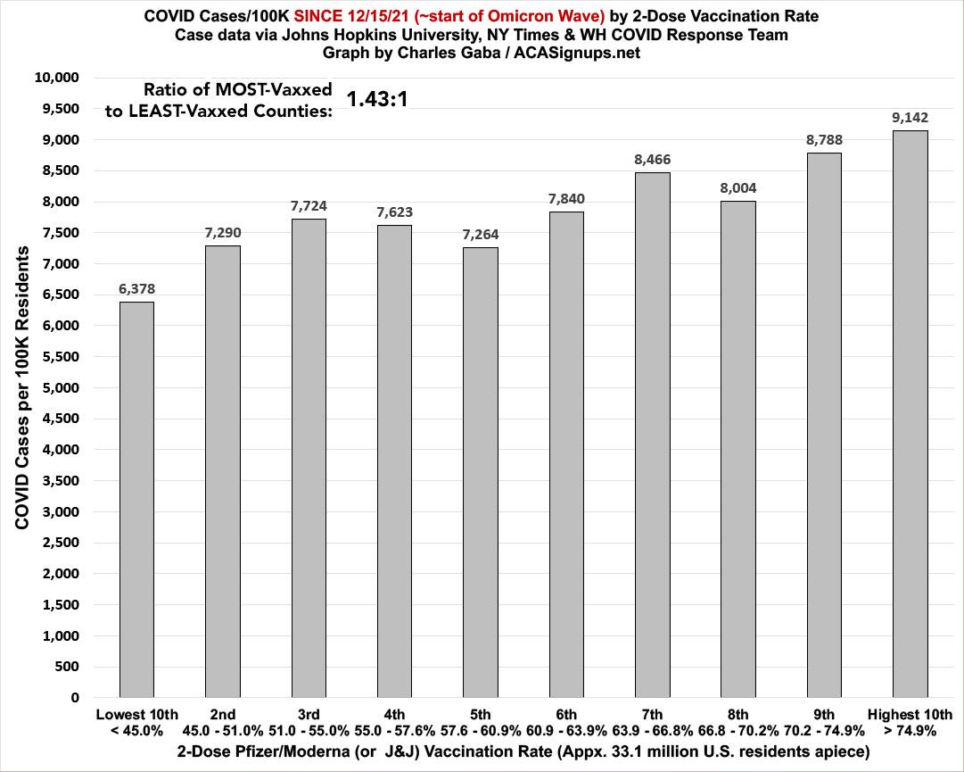 - Delta wave CASE rates: 2.12 higher in the least-vaccinated decile than the most-vaccinated decile