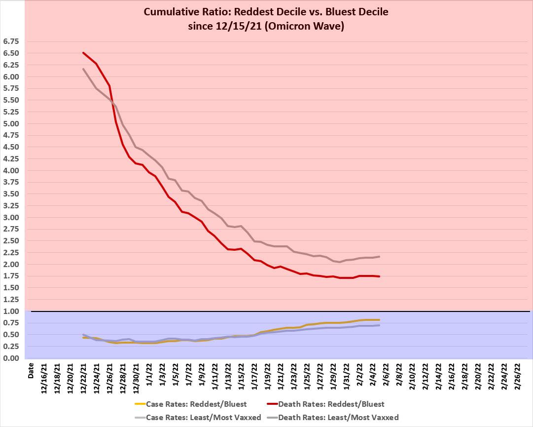 This shift over time is even more obvious (at least on the case rate side) when I go back to June 30th. As I recently noted, by mid-January, Omicron had almost completely cancelled out the "Red/Blue divide" in terms of cumulative case rates since June, which had reached as high as a 3:1 ratio before starting to recede...but the death rate was still 4x higher in the reddest counties in the U.S. than the bluest as recently as a couple weeks ago.