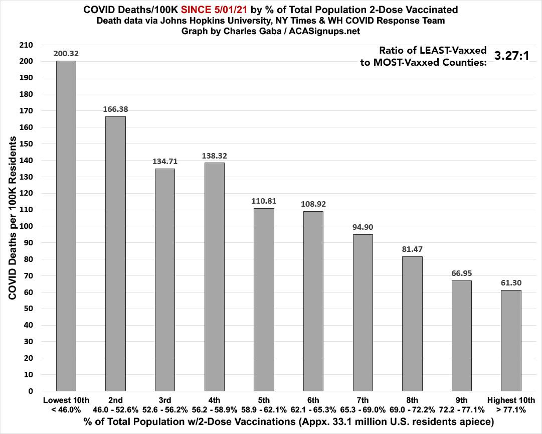 ...HOWEVER, when it comes to death rates, there's still a clear and dramatic correlation between how much of the population has been 2-dose vaccinated and its COVID death rate since last May. The least-vaccinated decile has a death rate nearly 3.3x higher than the most-vaccinated decile:
