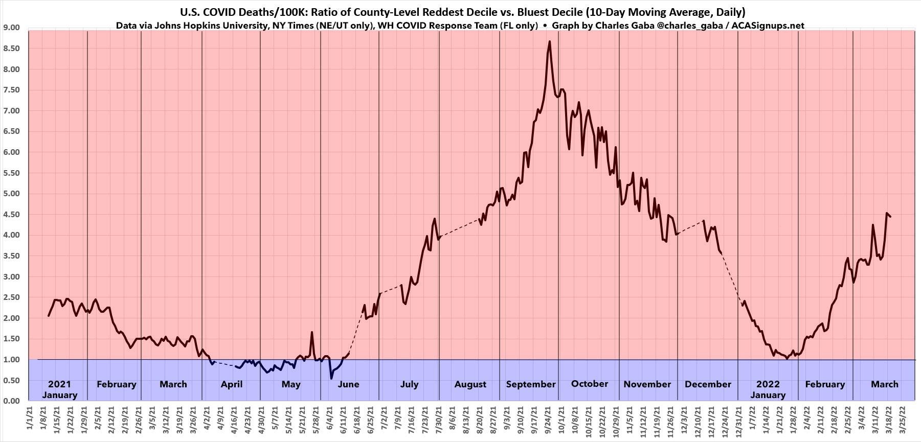The graph below shows how the ratio of case and death rates in the reddest and bluest deciles have changed over time. The gap reached a peak of 4.5x higher at the height of the Delta wave last fall before dropping significantly during the Omicron wave...but since then it's flattened out and is now moving back up again. Note that the sudden bump last week was due to a one-time data adjustment by the Massachusetts Health Dept.: