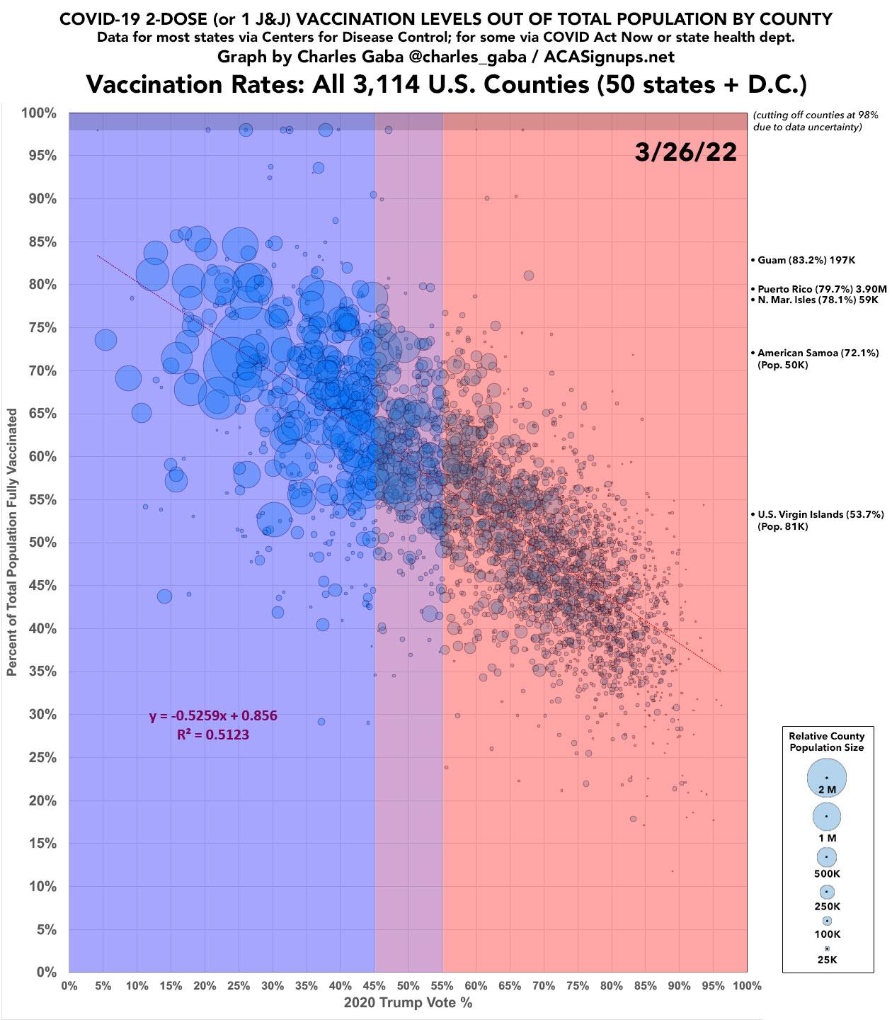 - There are several counties which have supposedly surpassed 100% vaccination rates; obviously that's impossible, and is due to discrepancies in either the vaccination data or actual population counts. In addition, people have moved, died, etc. since the 2020 Census was locked in as of April 2020. With that in mind, I've started setting the maximum vaccination rate for any county at 98%.