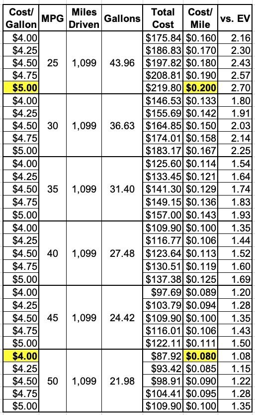 Average gas prices in the U.S. are around $4.76/gallon as of today, and $4.94/gallon in Michigan. In the table below, I look at gas prices ranging from $4.00 to $5.00, and ICE cars getting between 25 & 50 MPG. I then compared the average cost (in gas only, remember) per mile against my real-world EV 7.4¢ per mile: