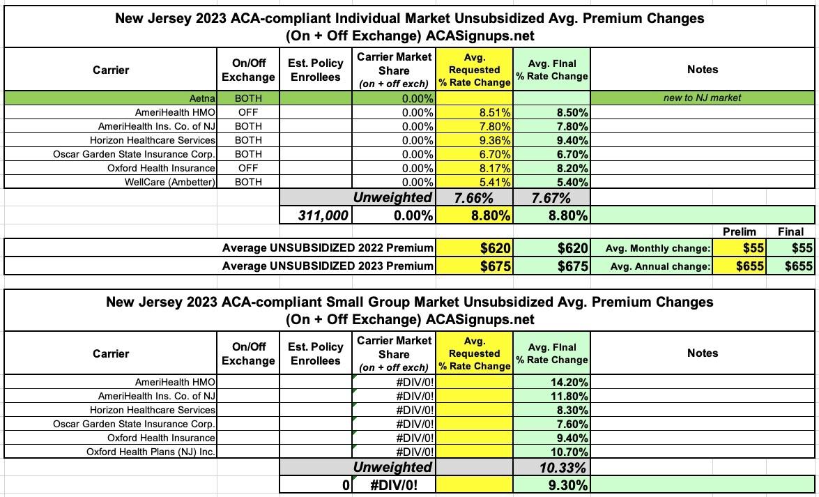 New Jersey: Final avg. unsubsidized 2023 #ACA rate changes: +8.8%