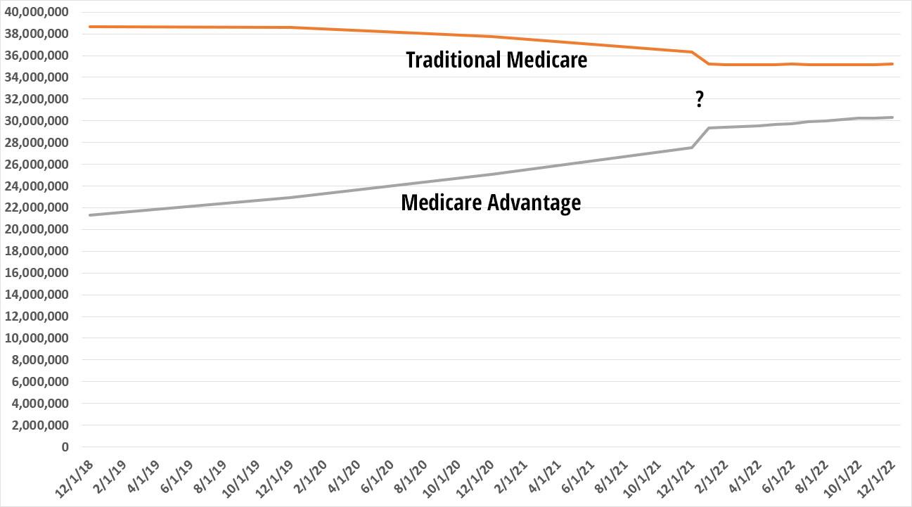 With the historic numbers available, I've put together a simple graph showing how both Traditional Medicare and Medicare Advantage enrollment has changed over the past 4 years. The trend is gradual (aside from a sudden one-time jolt from December 2021 to January 2022...not sure what caused that) but steady: Medicare Advantage enrollment has increased from 35.5% of all Medicare enrollment to 46.2% as of December, and while its growth rate has slowed over the past year, it's still on course to hit 50% of all enrollees within the next 4 years, give or take.