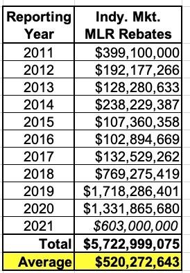 Over 11 years, individual market MLR rebates have averaged over a half a billion dollars per year...and over $1.1 billion per year for the past four years.