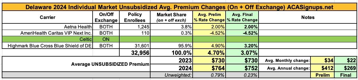 UPDATE: Delaware: *Final* avg. unsubsidized 2024 #ACA rate changes: +3.1% (down from 4.7%)