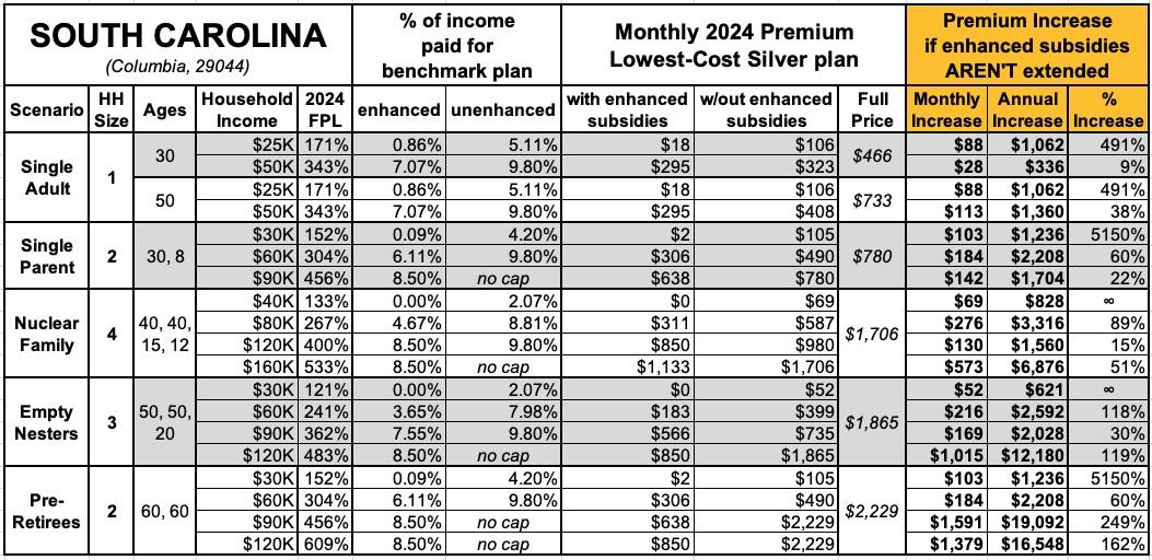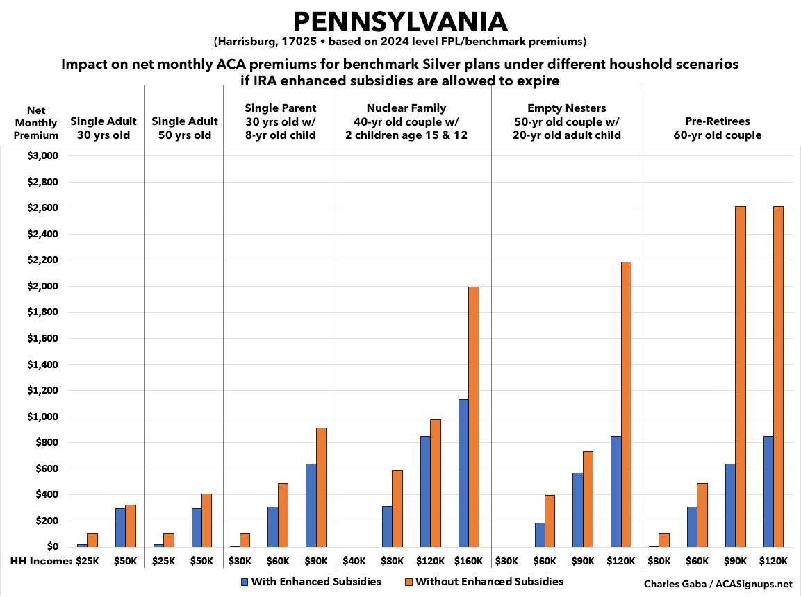 That's the macro level, however. As I did a couple of years ago when the subsidies were originally at risk of expiring in 2023, I decided to run the numbers myself to get an idea of just how much enrollees real-world health insurance premiums would go up in the event the ARPA/IRA subsidies are indeed allowed to expire at the end of next year.