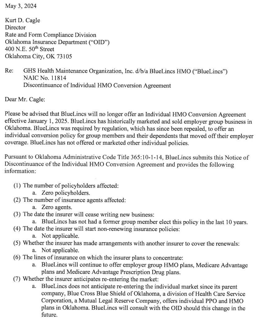 It's worth noting that BlueLincs HMO, which was only added to the OK individual market last year, is already being removed from it. In fact, as shown below, it looks like BlueLincs was a special line of policies offered at the point of a regulatory gun; apparently Blue Cross was required to create it as an option for group coverage members who move off of employer coverage. However, that regulation was apparently changed shortly thereafter, and no one ever actually enrolled in a BlueLinc plan anyway, so that's that.