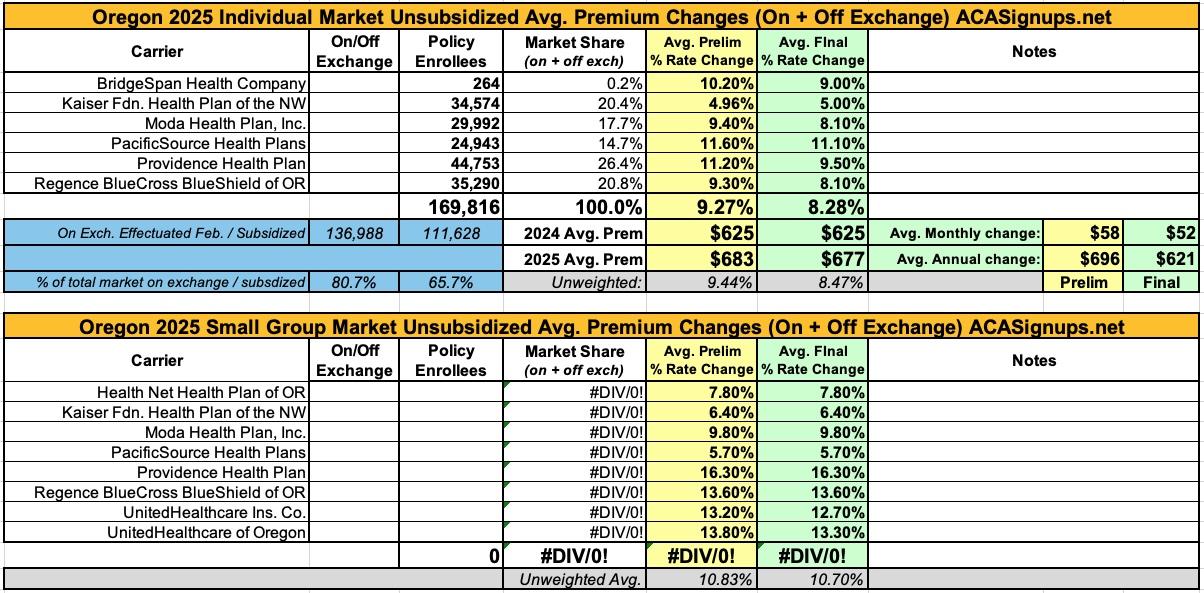 Oregon: *Final* avg unsubsidized 2025 ACA rate changes: +8.3%