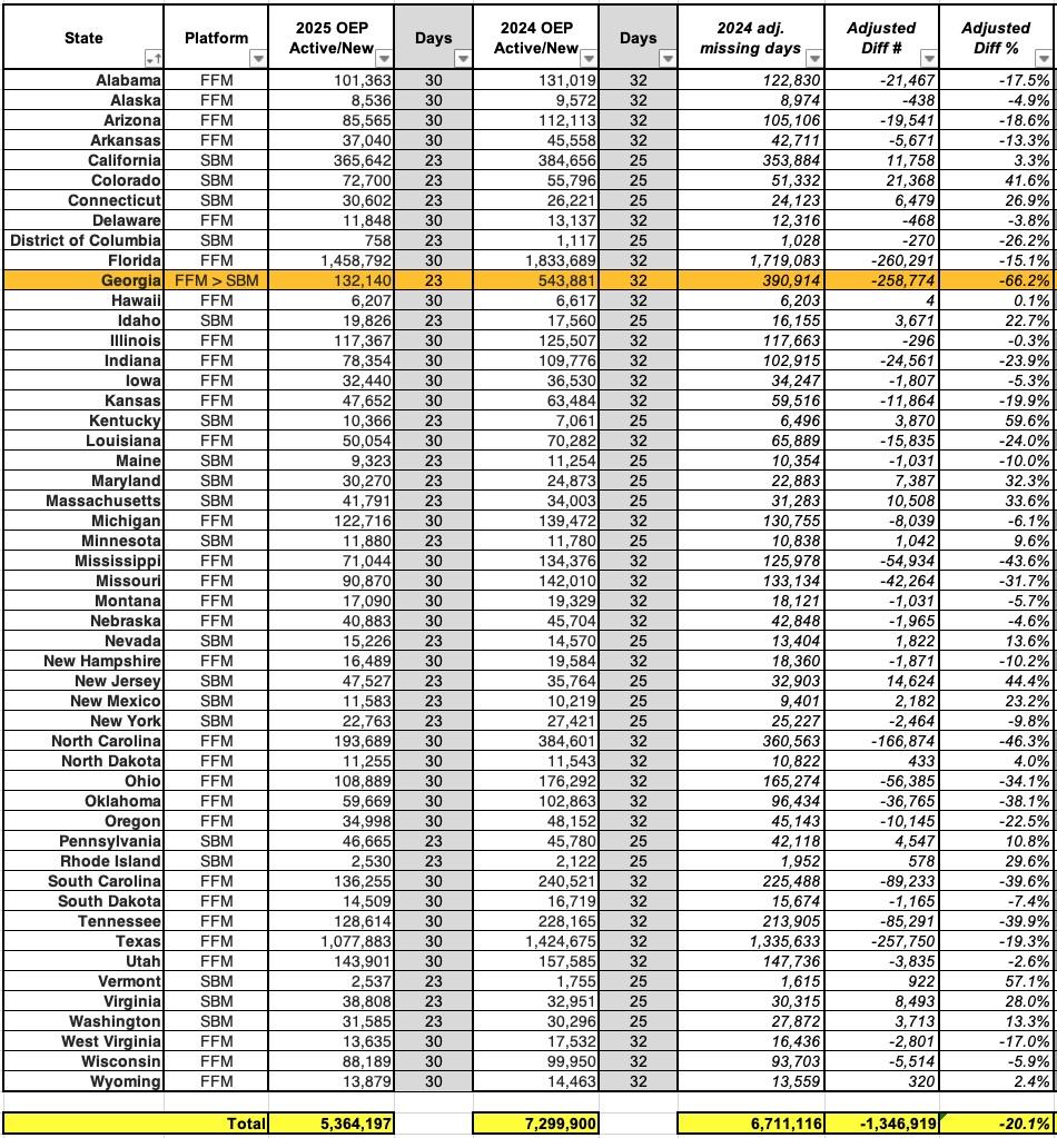 In addition, if you look only at 2025 FFM states (that is, not including Georgia in either year), active + new enrollments are still down 17% after adjusting for the 2 missing days.