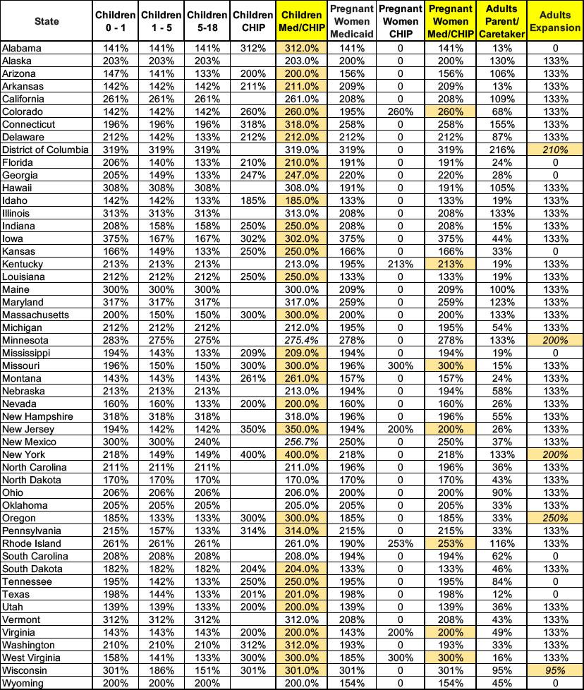 For instance, in my home state of Michigan, children are eligible for Medicaid if their household income is up to 212% of the Federal Poverty Level (FPL), while pregnant women are only eligible up to 195% FPL...and parents of minor children are eligible up to 54% FPL.