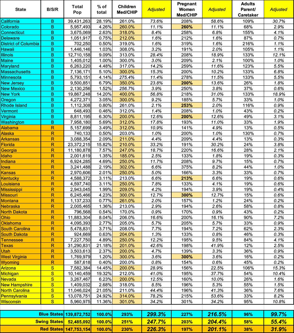 Looked at this way, blue states, on weighted average, cover children up to 299% FPL; pregnant women up to 217% and parents/caretakers up to 100% (actually 138% FPL since every blue state has expanded the program).