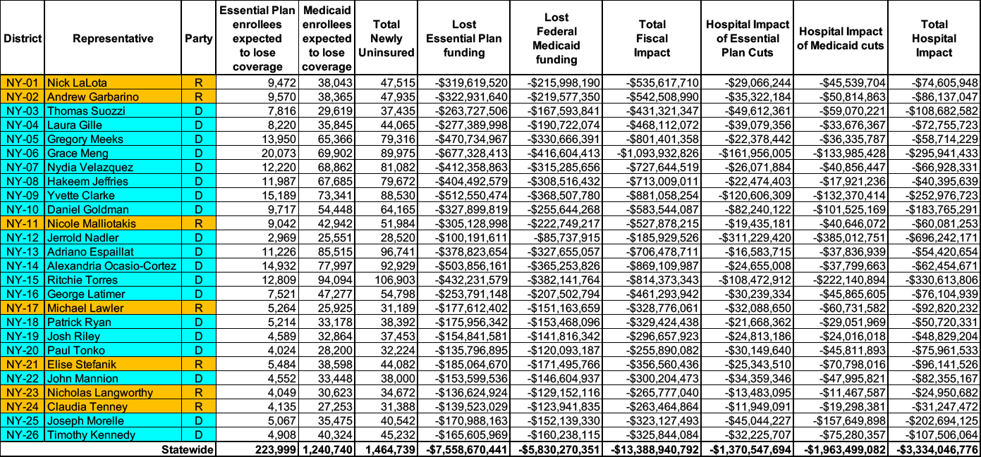 - 1.5 Million New Yorkers To Lose Healthcare Coverage and Become Uninsured; Over $3 Billion in Losses for New York’s Hospitals