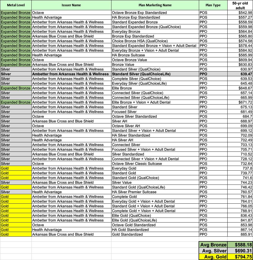 On the other hand, I also checked the full-price premiums for all 48 plans offered in Little Rock, Arkansas this year, and for the most part the Silver plans are priced pretty much how you'd expect them to be without any sort of Silver Loading or Premium Alignment: Bronze lowest, then Silver, then Gold.