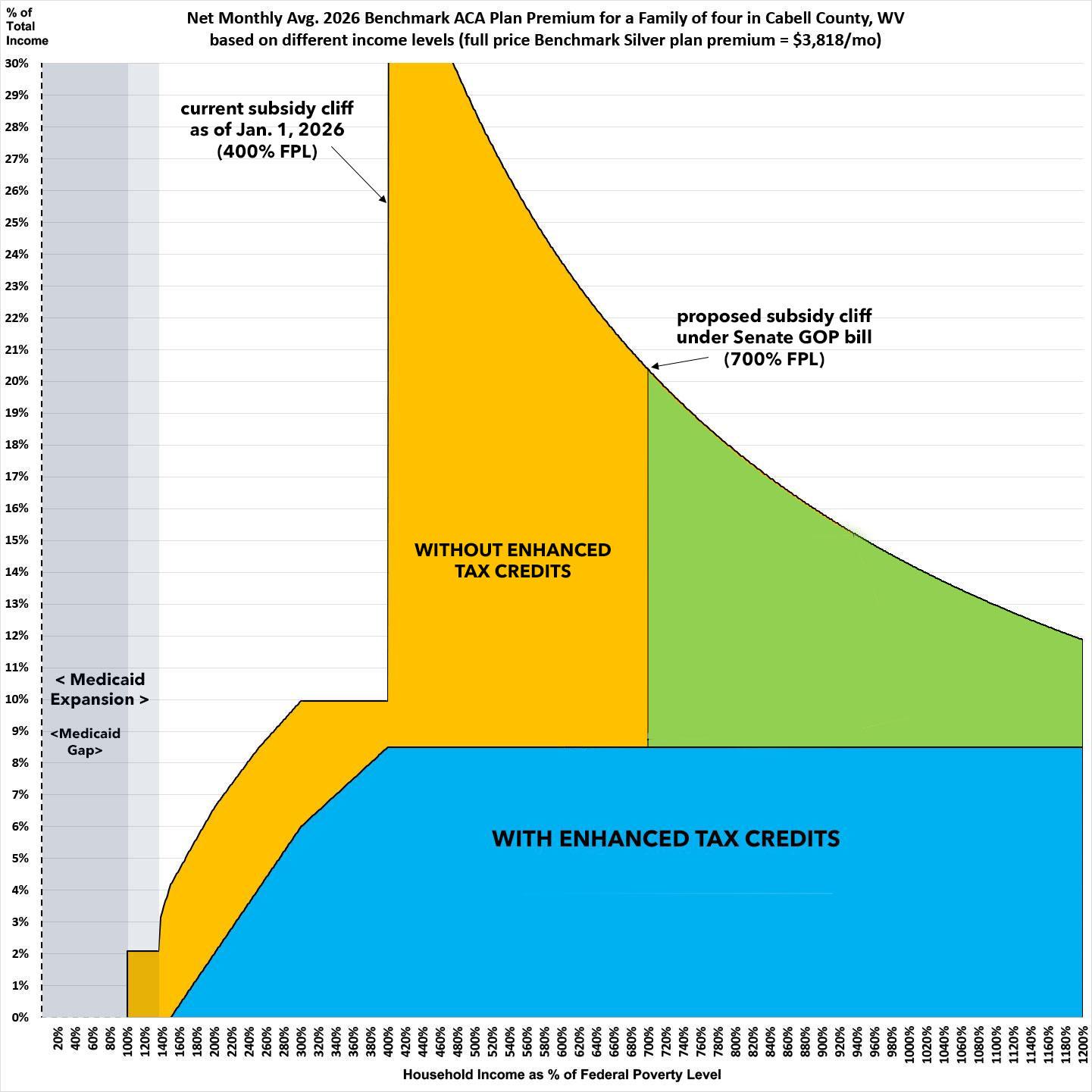 That's right: A 64-yr old couple living in Cabell County, West Virginia would still have to pay a jaw-dropping 43% of their gross income in premiums alone if they earn even $1 over 700% FPL, which is $148,050 for two people.