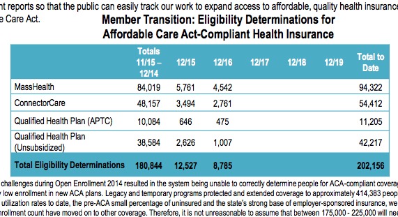 First, we have today's daily MA Health Connector Dashboard report, which states that there have been 148,453 QHP determinations thorugh yesterday (12/29). Assuming 50% of these have selected plans, that's around 74,200 QHP selections to date. In addition, the 134,803 Medicaid (MassHealth) enrollments are already locked in.