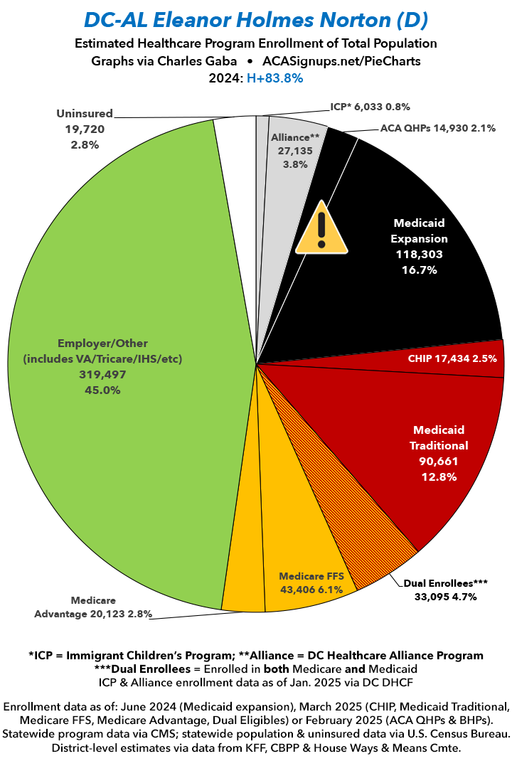 UPDATE 7/16/25: I've updated the web versions of the graphics with the most up-to-date enrollment data I have access to. The black sections w/the ⚠️ symbol are those most at risk of losing healthcare coverage due to H.R. 1, the "One Big Beautiful Bill Act" (aka the #MAGAMurderBill).