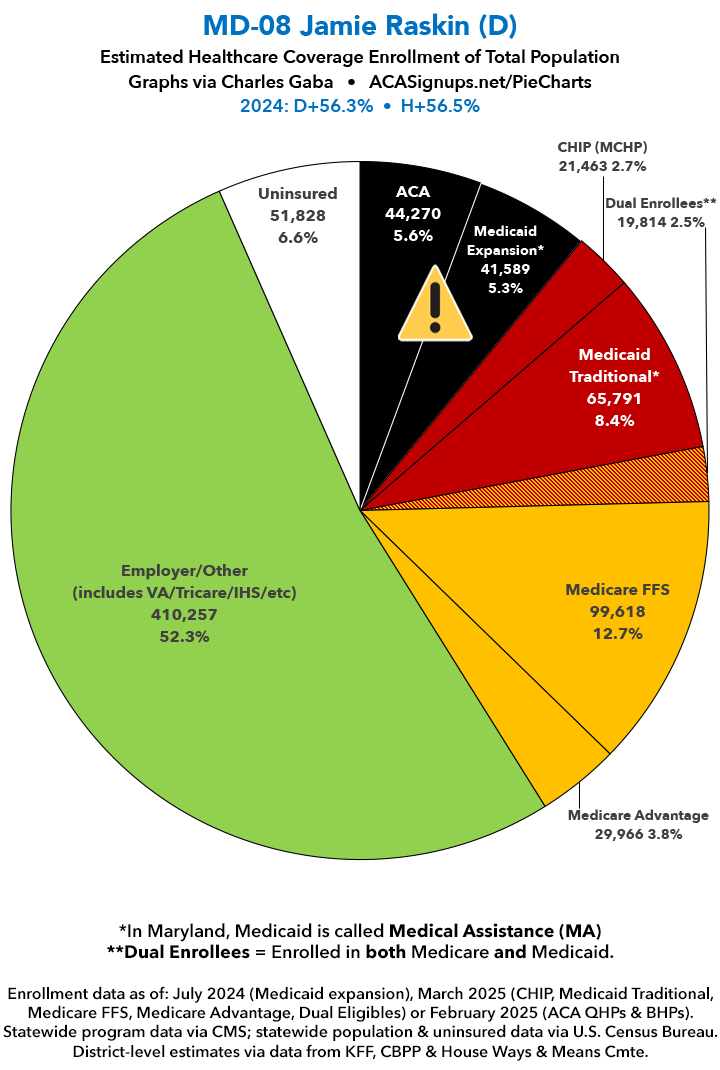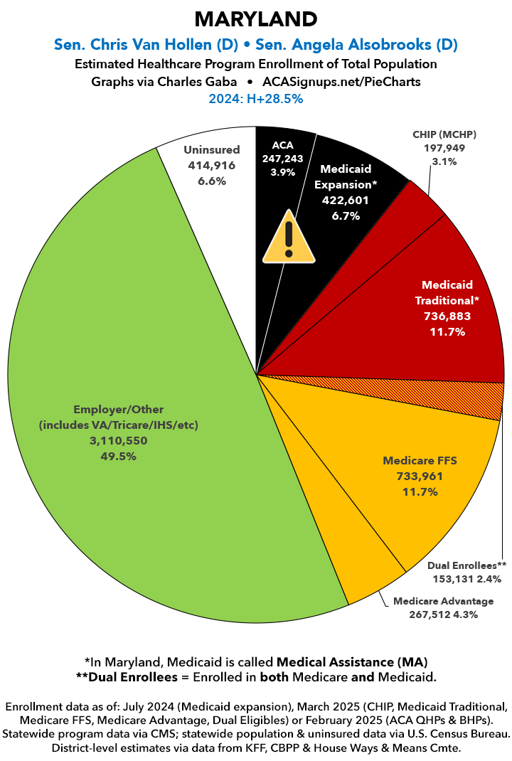 UPDATE 7/5/25: I've updated the web versions of the graphics with the most up-to-date enrollment data I have access to. The black sections w/the ⚠️ symbol are those most at risk of losing healthcare coverage due to H.R. 1, the "One Big Beautiful Bill Act" (aka the #MAGAMurderBill).
