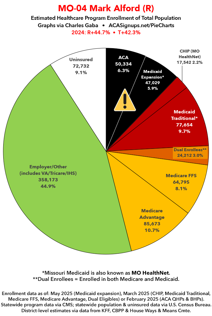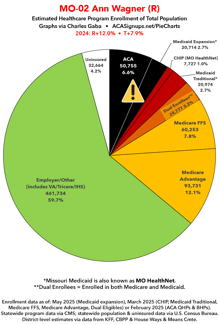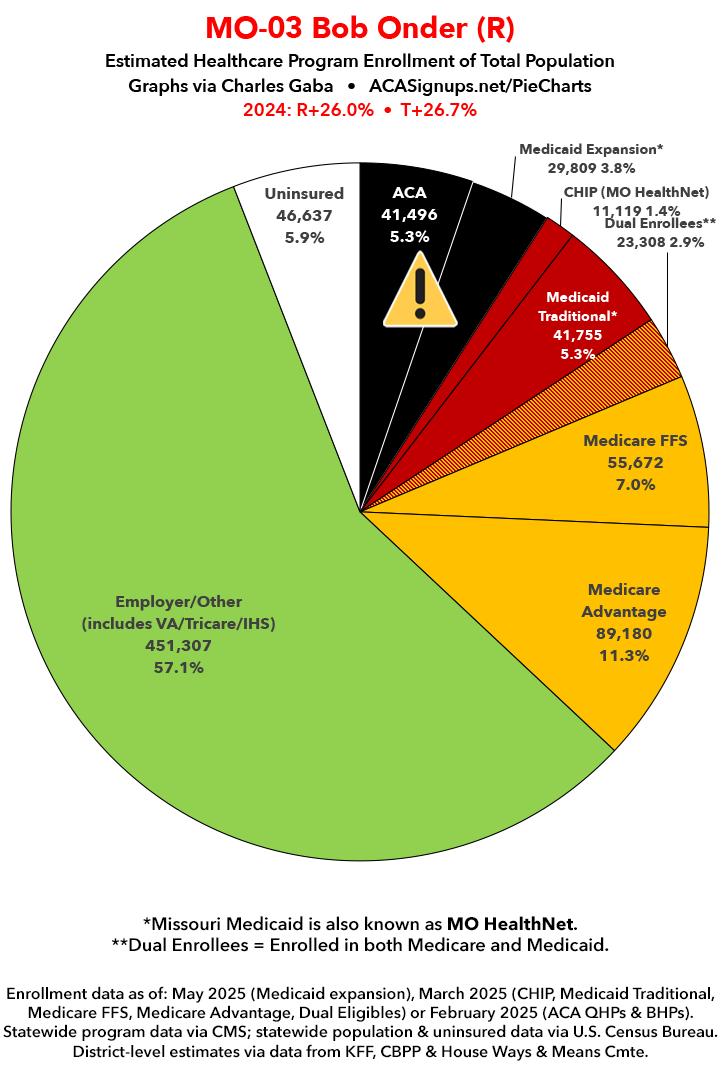 UPDATE 7/6/25: I've updated the web versions of the graphics with the most up-to-date enrollment data I have access to. The black sections w/the ⚠️ symbol are those most at risk of losing healthcare coverage due to H.R. 1, the "One Big Beautiful Bill Act" (aka the #MAGAMurderBill).