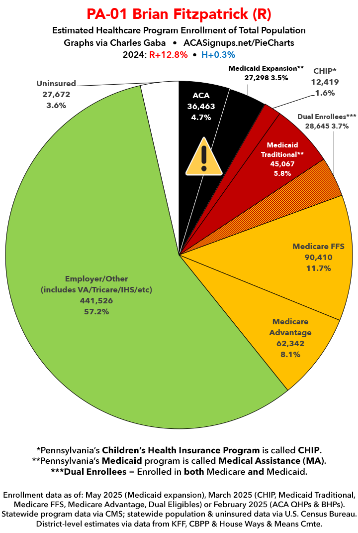 UPDATE 7/11/25: I've updated the web versions of the graphics with the most up-to-date enrollment data I have access to. The black sections w/the ⚠️ symbol are those most at risk of losing healthcare coverage due to H.R. 1, the "One Big Beautiful Bill Act" (aka the #MAGAMurderBill).