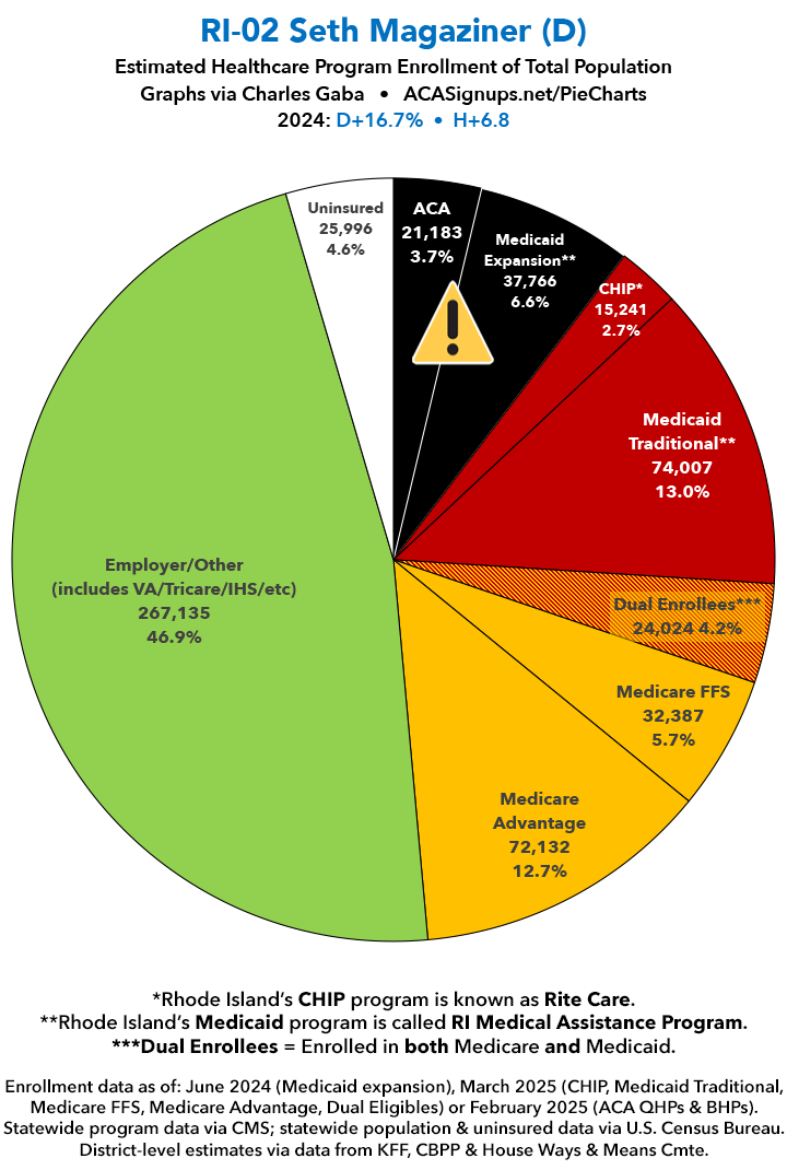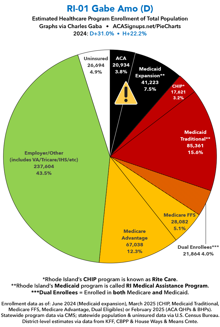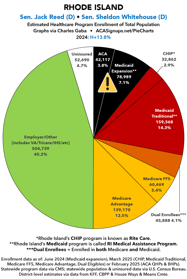 UPDATE 7/16/25: I've updated the web versions of the graphics with the most up-to-date enrollment data I have access to. The black sections w/the ⚠️ symbol are those most at risk of losing healthcare coverage due to H.R. 1, the "One Big Beautiful Bill Act" (aka the #MAGAMurderBill).​​​​​