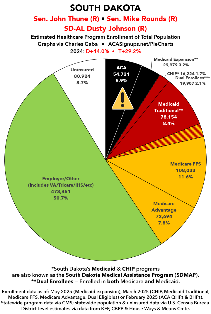 UPDATE 7/11/25: I've updated the web versions of the graphics with the most up-to-date enrollment data I have access to. The black sections w/the ⚠️ symbol are those most at risk of losing healthcare coverage due to H.R. 1, the "One Big Beautiful Bill Act" (aka the #MAGAMurderBill).
