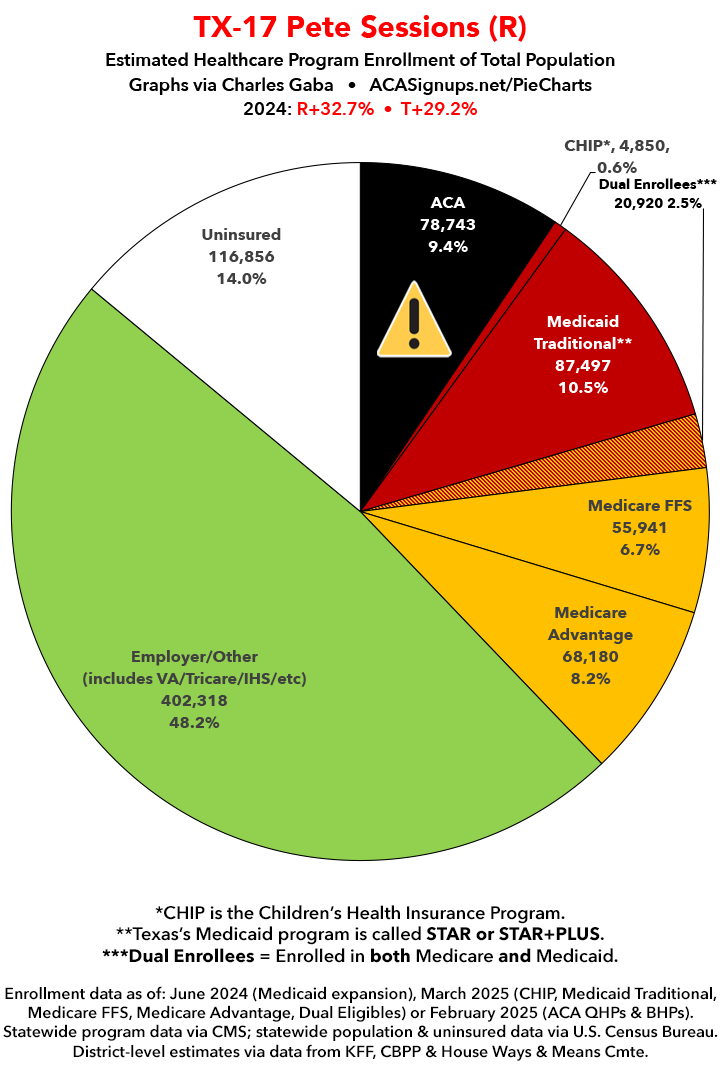 UPDATE 7/13/25: I've updated the web versions of the graphics with the most up-to-date enrollment data I have access to. The black sections w/the ⚠️ symbol are those most at risk of losing healthcare coverage due to H.R. 1, the "One Big Beautiful Bill Act" (aka the #MAGAMurderBill).