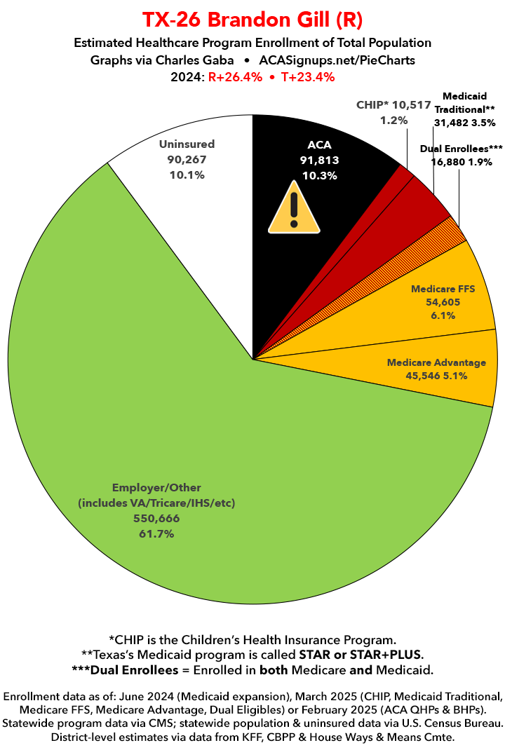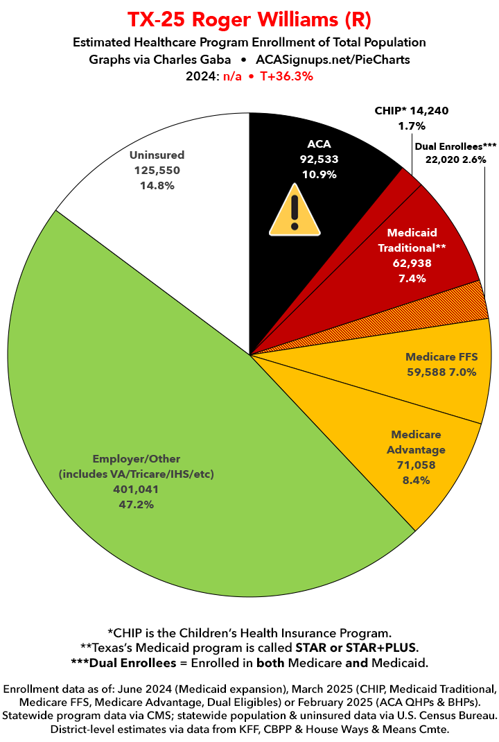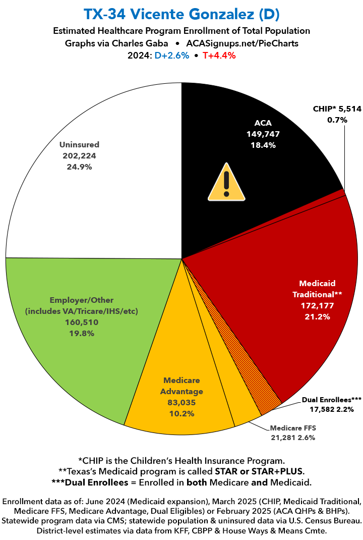 UPDATE 7/14/25: I've updated the web versions of the graphics with the most up-to-date enrollment data I have access to. The black sections w/the ⚠️ symbol are those most at risk of losing healthcare coverage due to H.R. 1, the "One Big Beautiful Bill Act" (aka the #MAGAMurderBill).