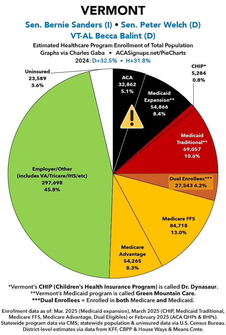 UPDATE 7/15/25: I've updated the web versions of the graphics with the most up-to-date enrollment data I have access to. The black sections w/the ⚠️ symbol are those most at risk of losing healthcare coverage due to H.R. 1, the "One Big Beautiful Bill Act" (aka the #MAGAMurderBill).
