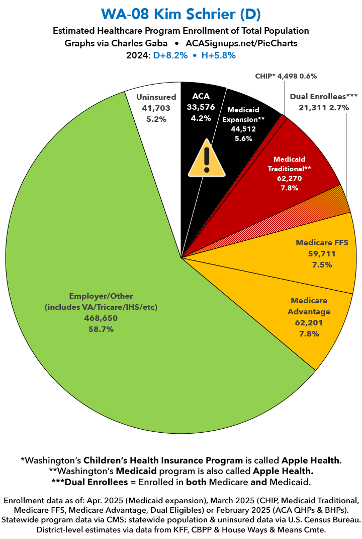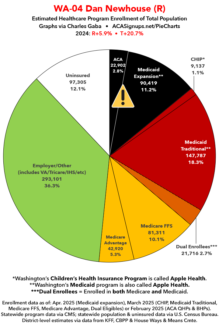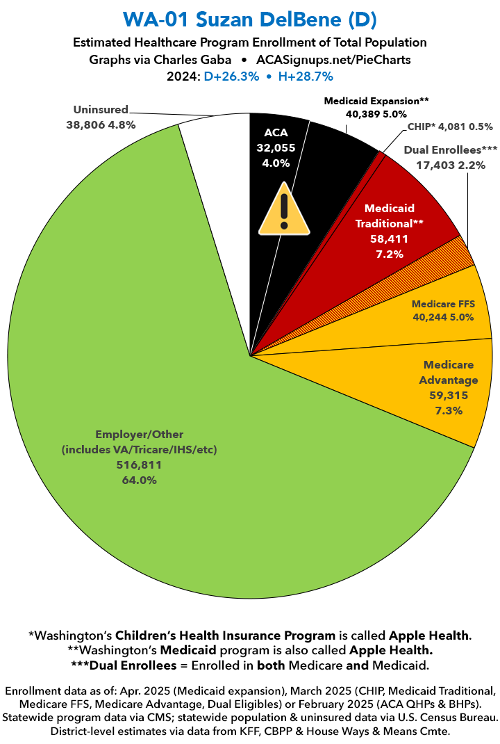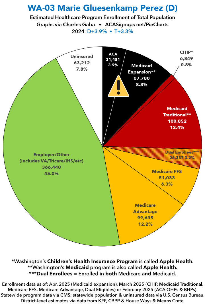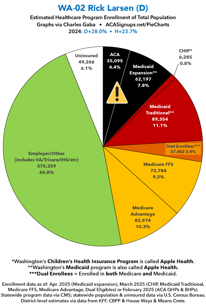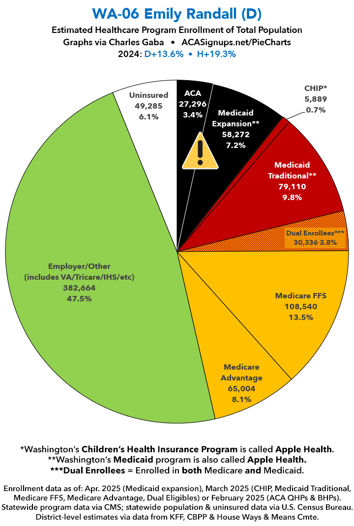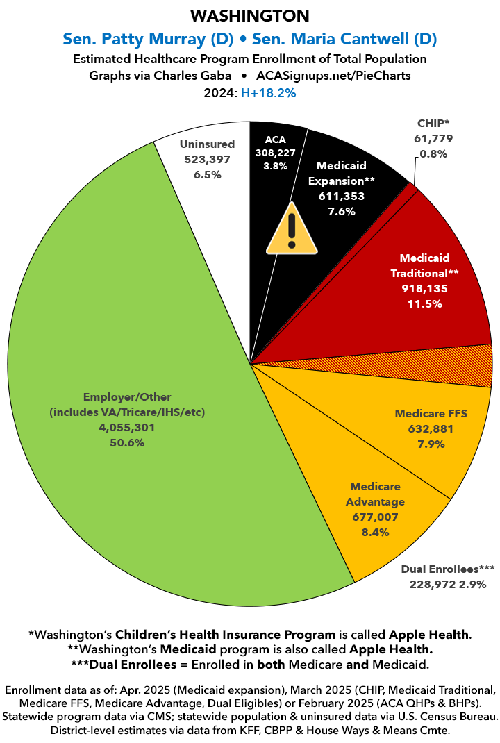 UPDATE 7/15/25: I've updated the web versions of the graphics with the most up-to-date enrollment data I have access to. The black sections w/the ⚠️ symbol are those most at risk of losing healthcare coverage due to H.R. 1, the "One Big Beautiful Bill Act" (aka the #MAGAMurderBill).
