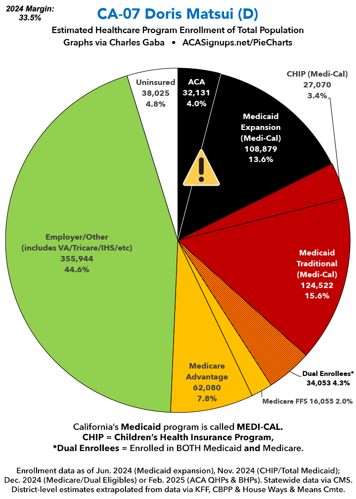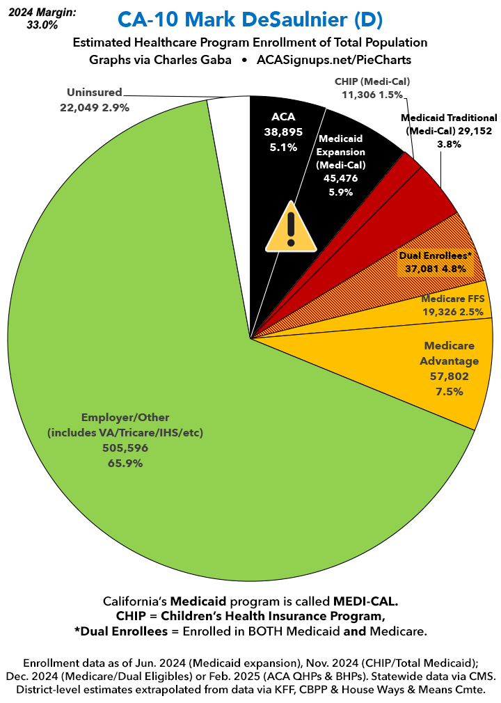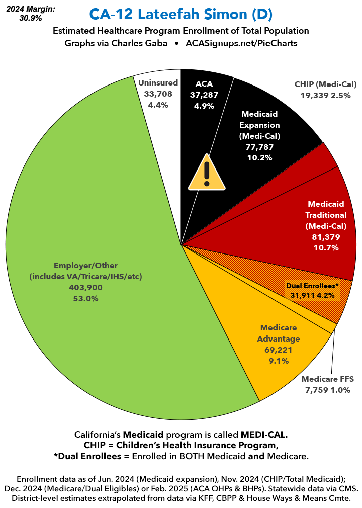 With the pending dire threat to several of these programs (primarily Medicaid & the ACA) from the House Republican Budget Proposal which recently passed, I'm going a step further and am generating pie charts which visualize just how much of every Congressional District's total population is at risk of losing healthcare coverage.