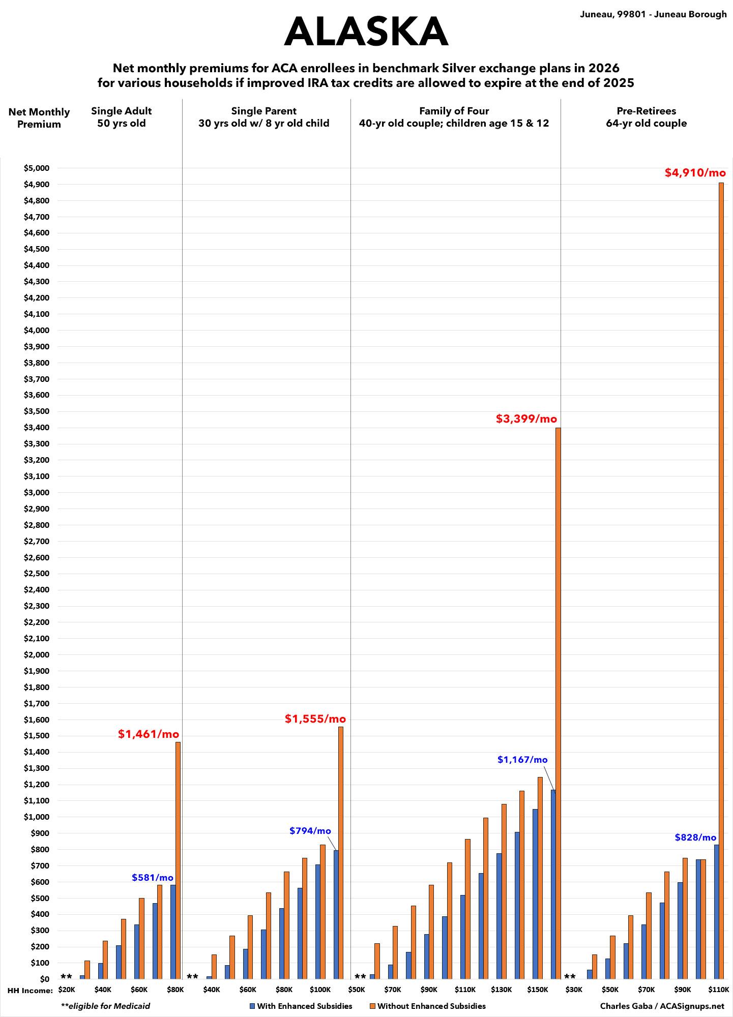 Benchmark Silver premiums vary widely depending on where you live & other factors. For Alaska I'm usuing Juneau.