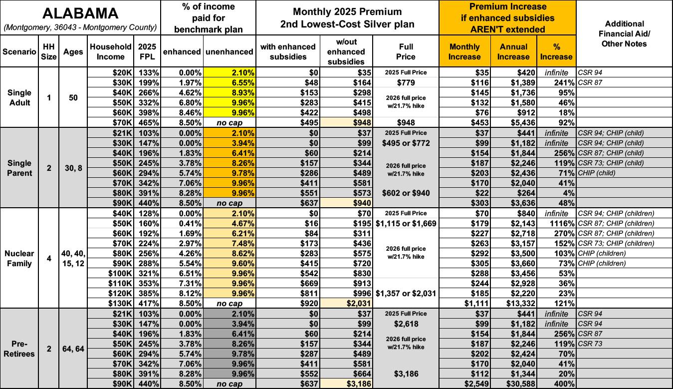 NEW: The original version of this analysis included a 4.3% increase in the unsubsidized benchmark plan premium based on a projection by the Congressional Budget Office. However, that was a national average projection which didn’t take into account other factors like increased utilization, medical inflation and so on. This updated version assumes the actual 2026 Alabama rate filings which average 21.7% statewide.