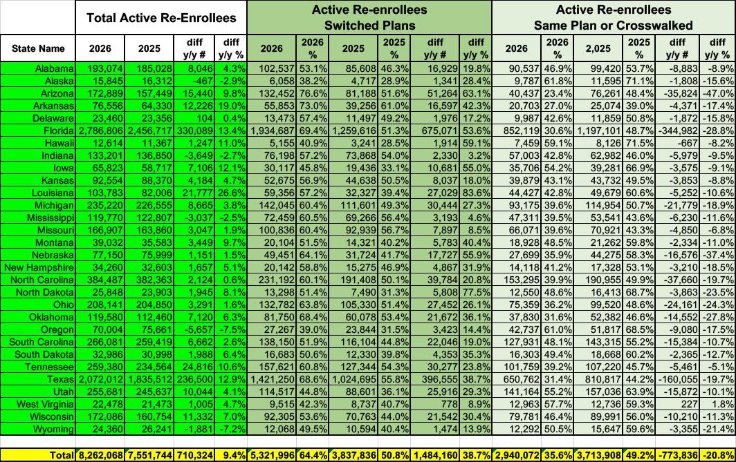 This means that over 1/3 of all HC.gov enrollees (33.7%) are existing enrollees who switched policies for 2026. By contrast, last year only 23% did so.