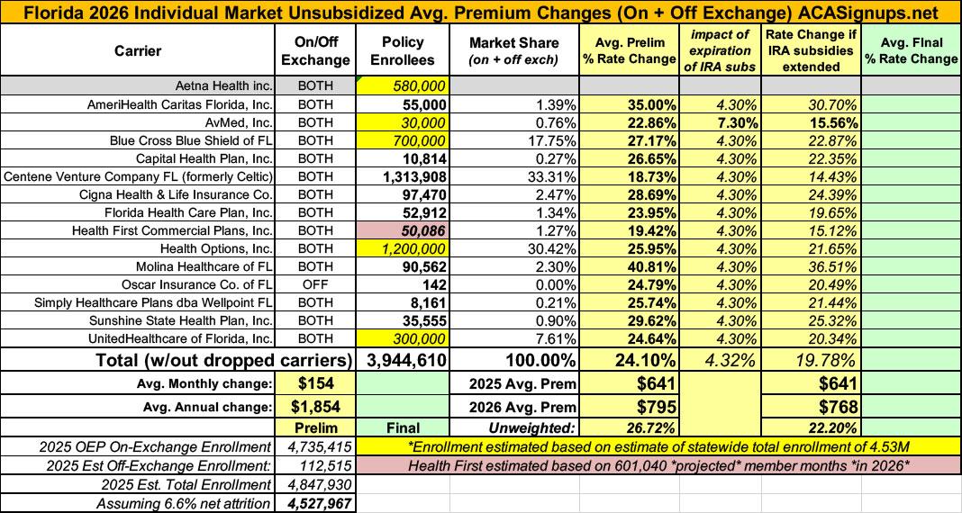 UPDATE 10/17/25: Oh for heaven's sake. It turns out that the Florida Office of Insurance Regulation (FLOIR) quietly published their final/approved 2026 rate filings for the individual market over two months ago and I didn't find out about it until now! A big shout-out to "techbud251" in the comments for alerting me to this PDF buried in the FLOIR website, with the final column labeled "Average % Change Approved."