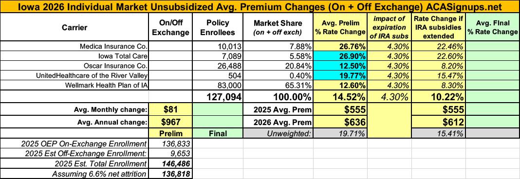 UPDATE 8/14/25: Iowa Total Care, Oscar Insurance and UnitedHealthcare of the River Valley have submitted revised filings bumping up the weighted average increase to 14.5%.