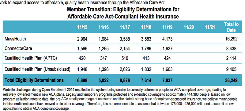 As I noted yesterday, the good news is that Massachusetts is posting daily metric reports on the new ACA Health Connector exchange, a level of frequency which surpasses even Minnesota.